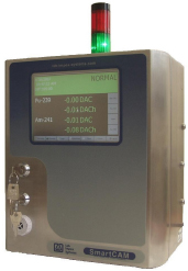 In operation the SmartCAM continually monitors alpha and beta particulates deposited on a static card mounted filter (optional moving filter will also be available) with a high efficiency solid state detector. Air is drawn through the card-mounted filter by an external vacuum pump or distributed vacuum main. Where the SmartCAM sets itself apart from other systems is in its ability to accurately determine background (Radon and Gamma) ensuring the limitation of expensive false alarms. An enhancement contributing to this unrivalled performance is the introduction of temperature and barometric pressure compensation (patent pending). This enhancement enables stabilisation of the alpha spectrum which contributes to a reduction in spectrum shift known to be caused by changes in temperature and barometric pressure, thus aiding improved detection accuracy. application fieldRadiation monitoring for Homeland Security and Environmental protection. specifications