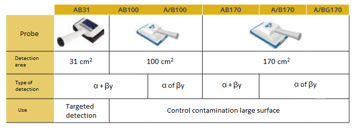 Depending on the probe, the operator can assess persons and small or large areas to detect alpha, beta or alpha & beta radioactive contamination.